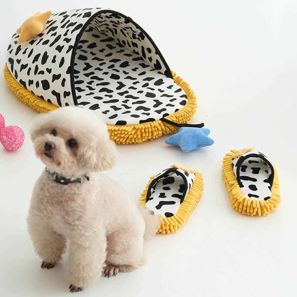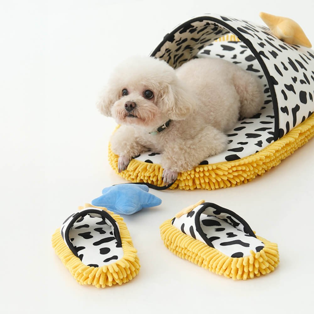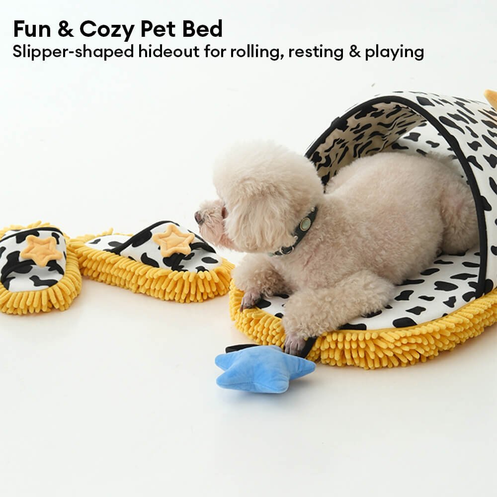 Bring a little whimsy and a lot of comfort into your home with this delightful Cow-Print Plush Pet Bed & Slippers Set. Designed for the pet-parent duo that loves staying cozy in style. this set includes a soft slipper-shaped pet bed and a pair of matching house slippers for you—because twinning with your furry best friend is always a good idea.